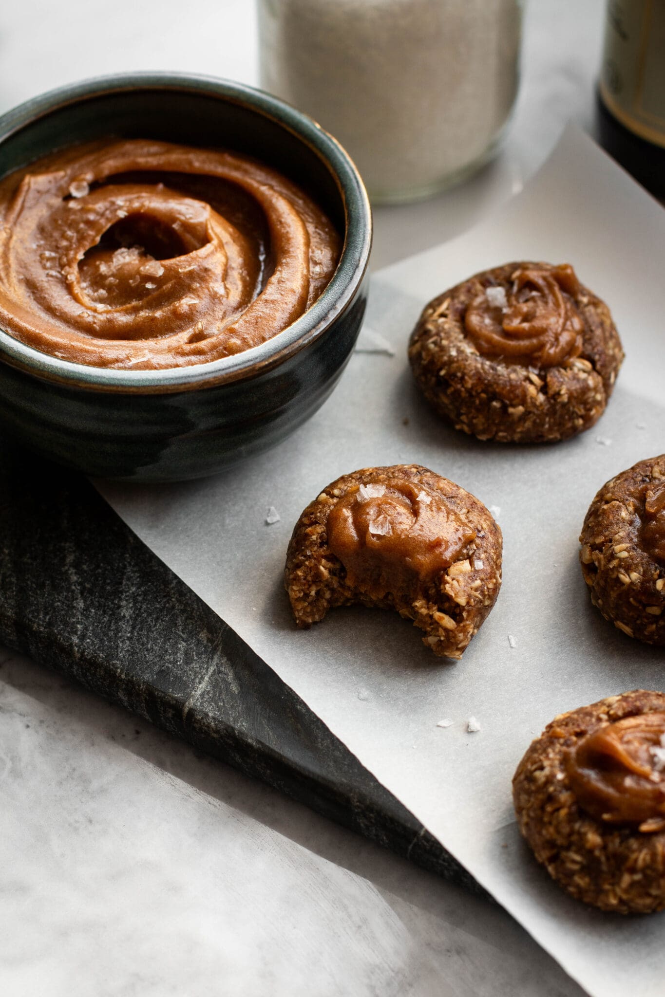- Put a small amount of date caramel in each cookie. Sprinkle with flaky salt.